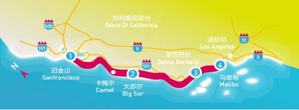 • 加州1號(hào)公路—丹麥村—圣塔芭芭拉—圣塔莫妮卡—洛杉磯
