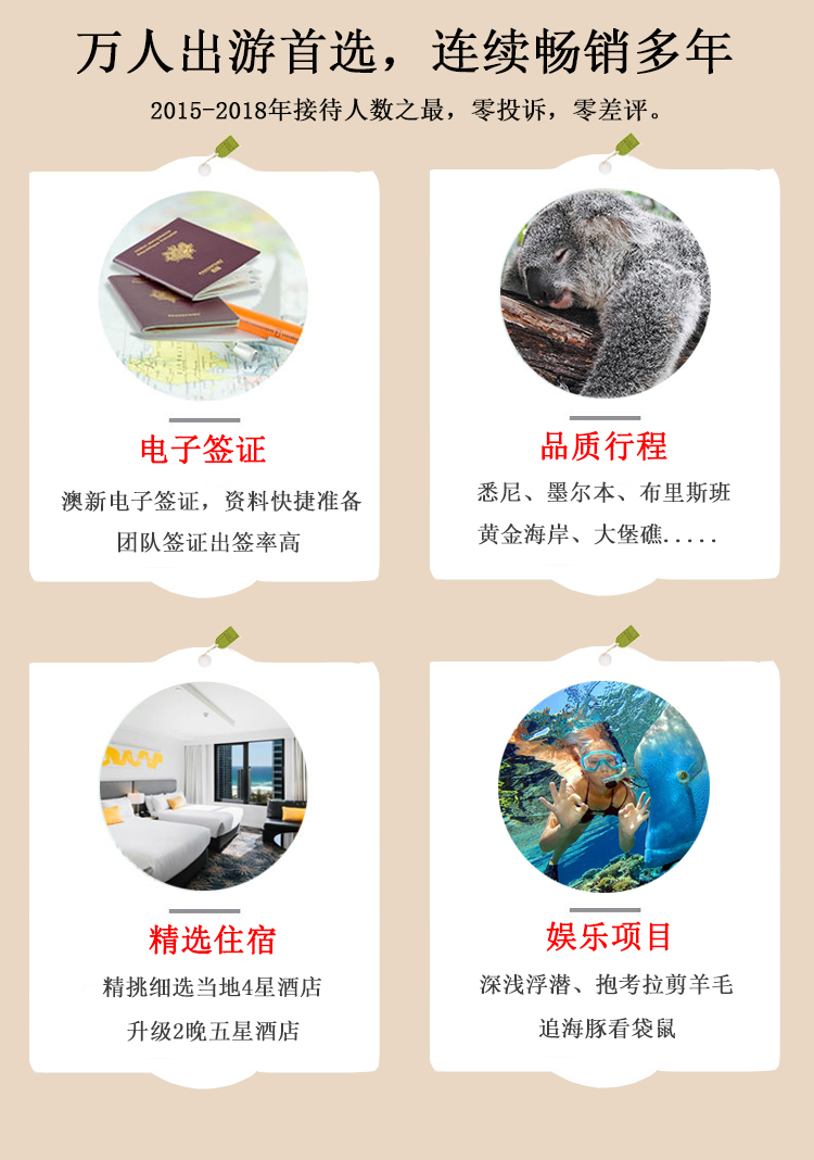 3.  用餐:澳大利亞和新西蘭境內(nèi)的早餐均為酒店內(nèi)早餐,午晚餐為中餐或自助:中式餐為八菜一湯,10-12人一桌(自助餐除外);用餐時間在飛機或船上以機船餐為準,不再另退餐費。如遇到早航班,一般安排早餐盒或快餐,如果不用,費用不退。境外短程的DJ及JQ航機上的酒水及小食品均須自行付費。