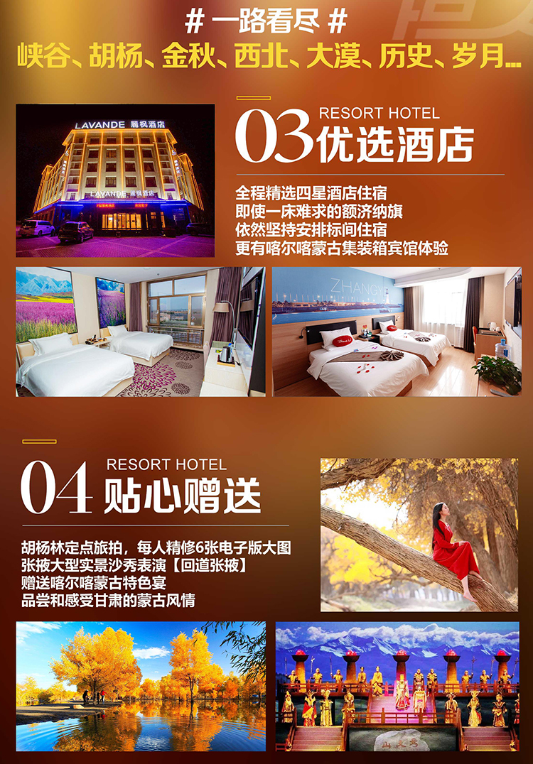【弱水胡楊景區(qū)】(活動(dòng)時(shí)間約90 分鐘,含區(qū)間)這里素有醉美胡楊林之稱,他坐落于美麗的弱水河畔(即黑河-弱水三千,我只取一瓢飲)的佳句正是意指此河,景區(qū)內(nèi)五湖、四島、九重林的自然景觀,經(jīng)過(guò)弱水主河道千年沖刷行成,每個(gè)景觀都是一副美不勝收的畫卷,風(fēng)光旖旎,景色壯麗,漫天紅霞,橘紅圓日,令人陶醉。景區(qū)內(nèi)的胡楊林保留了最原汁原味的自然美景,緊密的將沙漠、神水、野胡楊三者天然美景完美結(jié)合。弱水泱泱,流淌著悠遠(yuǎn)永久的居延古韻~~~大漠蒼蒼,熔鑄著堅(jiān)毅頑強(qiáng)的名族精神;后前往額旗入住酒店休息!