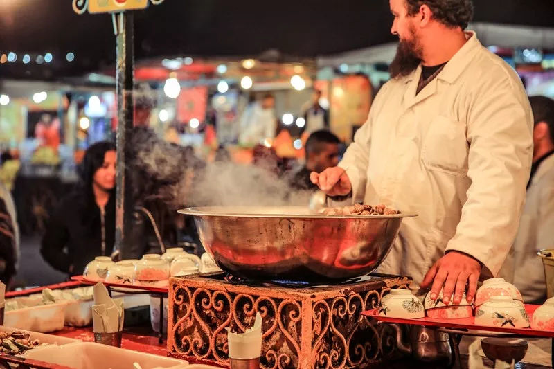 馬拉喀什最著名的廣場(chǎng),也叫不眠廣場(chǎng),是個(gè)巨大而熱鬧非凡的露天廣場(chǎng)。這里有琳瑯滿目的摩洛哥工藝品,更是摩洛哥美食的聚集地。整個(gè)廣場(chǎng)就是一個(gè)巨大的露天餐廳,遠(yuǎn)遠(yuǎn)就能聞到烤肉的香味,摩洛哥除了分量十足的羊肉湯和烤羊肉外,蝸牛湯也是必吃的特色小吃。