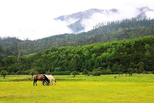 魯朗海拔3700米,位于距八一鎮(zhèn)80公里左右的川藏路上,坐落在深山老林之中;這是一片典型高原山地草甸狹長地帶。兩側(cè)青山由低往高分別由灌木叢和崐茂密的云杉和松樹組成“魯朗-”;中間是整齊劃一的草甸,崐猶如人工整治一般;草甸中,溪流蜿蜒,泉水潺潺,草坪上報春崐花、紫苑花、草梅花、馬先蒿花等成千上萬種野花怒放盛開,頗崐具林區(qū)特色的木籬笆、木板屋、木頭橋及農(nóng)牧民的村寨星落棋布、崐錯落有秩,勾畫了一幅恬靜、優(yōu)美的“山居圖”。
