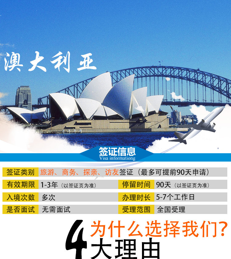 3、不需要本人遞交和面簽,您只需按網(wǎng)站資料準備,并遞交給我們,我們將負責全程代辦澳大利亞旅游簽證;