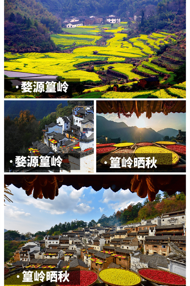 12:00-16:00游覽【篁嶺賞油菜花--婺源山居古村落-篁嶺4A級景區(qū)(不含往返纜車120元/人)】(游覽2.5小時)中國最美沙洲,贈送最佳攝影地【月亮灣】,游覽梯云村落.曬秋人家——【篁嶺景區(qū)】有“南方布達拉宮”之稱,篁嶺村落“天街九巷”似玉帶將精典古建串接,徽式商鋪林立,前店后坊,仿佛一幅流動的縮寫版“清明上河圖”。 周邊千畝梯田簇擁,四季花海展示驚艷的“大地藝術(shù)”。 窗銜篁嶺千葉匾,門聚幽篁萬畝田,因“其地多篁竹”得名,嶺高500米,建村500多年;