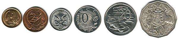 20分硬幣上印有鴨嘴獸,(很快將被替換成板球傳奇人物唐納德·布萊德曼(Donald Bradman) ;10分硬幣上印有翩翩起舞的的雄琴鳥;5分硬幣上印有針鼴鼠。